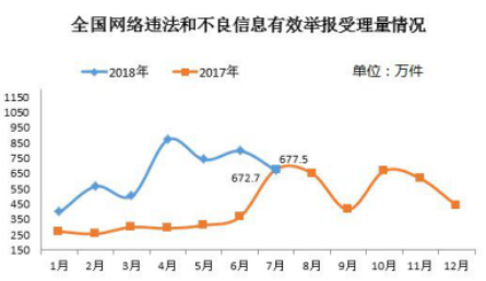 7月份,全国各级网络举报部门受理有效举报672.7万件,环比、同比分别下降16.1%和0.7%。其中,中国互联网违法和不良信息举报中心受理7.8万件,环比、同比分别增长17.7%和15.3%;各地网信办举报部门受理110.9万件,环比、同比分别下降64.9%和75.3%;全国主要网站受理553.9万件,环比、同比分别增长15.8%和1.5倍。