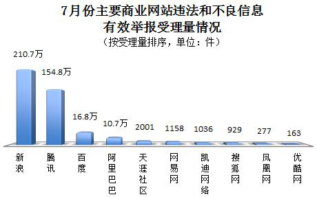 在全国主要网站受理的有效举报中,新浪(新浪微博、新浪网)、腾讯(微信、QQ、腾讯安全服务平台、腾讯网、腾讯微博)、百度、阿里巴巴等主要商业网站受理量占71.1%,为393.7万件。