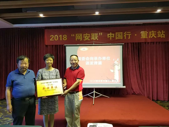 ▲网安联秘书长黄丽玲为重庆协会颁发网安联中国行(重庆站)承办单位的牌匾,右重庆市信息安全协会理事长张为群、左重庆市信息安全协会秘书长王建接受牌匾。