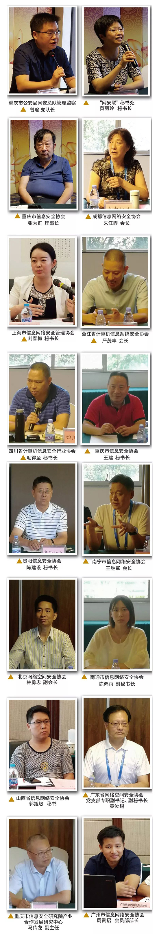 正当中国国际智能产业博览会在重庆开展之际,8月24日至25日,“网安联.中国行”重庆站系列活动成功举行。重庆市公安局网安总队原政委,重庆市信息安全协会常务副理事长张平接见“网安联.中国行”重庆站系列活动的领导和代表时表示欢迎和重视这次系列活动。在这次系列活动首日举行的网安联成员单位负责人座谈会上,网安联秘书长黄丽玲,重庆市公安局网安总队管理监察支队长曾瑜,重庆市信息安全协会理事长张为群、秘书长王建出席座谈会并讲话。来自重庆、北京、广东、四川、浙江、成都、贵阳、南宁、丽水等省市网络安全社会组织领导和代表30人多参加座谈会。