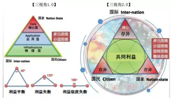 其中,多元思维,就是观察问题切忌从一点出发,一条射线发射后不管,如何能够跳出单点迷思和二元对立,需要建立三视角。三视角可以形成看问题的稳定的三脚架和包容的对话框。分层思维,就是在多元思维的基础上,再利用三角形这个金字塔结构,上尖、下宽,便于分层抓主要矛盾,区别对待(例如,网络主权问题有物理层、应用层和核心层)、分清主次、求同化异,不是铁板一块,不能一概而论。这个世界是多元的也是多层的,不能非此即彼、非零即一、非好即坏,分层思维可以解决问题。旋转思维,就是换位思考,分别以每个视角为三角形的顶点进行旋转,对其利益诉求分层。每个行为体都有核心层,即小三角,需要尊重,不轻易触碰,允许“存异”,同时,各自小三角又要限定在适度范围,任何一方都不能一味追求自身利益最大化、绝对化,须留出小三角之外相互兼容的共享区、求同区。核心区尊重差异,共享区求同共治。整体思维,是在以上三个思维基础上的拓展。任意一个三角形一定对应一个外接圆和内切圆。可以把外接圆看作是三视角三个行为体,涉及事物的差异性、多样性、风险性、不确定性。它的内切圆代表三个行为体的共同利益。在三角形周长不变的前提下,等边三角形的内接圆面积最大,外接圆面积最小,且外接圆圆心落在三角形内,让整个系统具备稳定与和谐性。这说明,各方共处的三角形空间内,每一方都应受到共同利益约束,只有各自让渡部分私权的自由度,才能让各方利益平衡,共享空间才能最大。如果任何一方想把自己小三角的自由度再扩大,从60度扩大到120度,最后到极致180度。那么,这个三角形就回归到一条直线。也就是说,内切圆的面积为零,而外接圆面积最大。这时,这个系统就严重崩溃、失衡,一切化为乌有。因此,任何事情都不要做过头,过犹不及、适得其反。如果说某个国家要是把本国利益优先强调到不适当的程度,不惜一切,以邻为壑,这样损人不利己,还不如守住60度的左右。