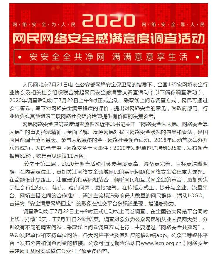 2020年网民网络安全感满意度调查活动即将启动--法治--人民网