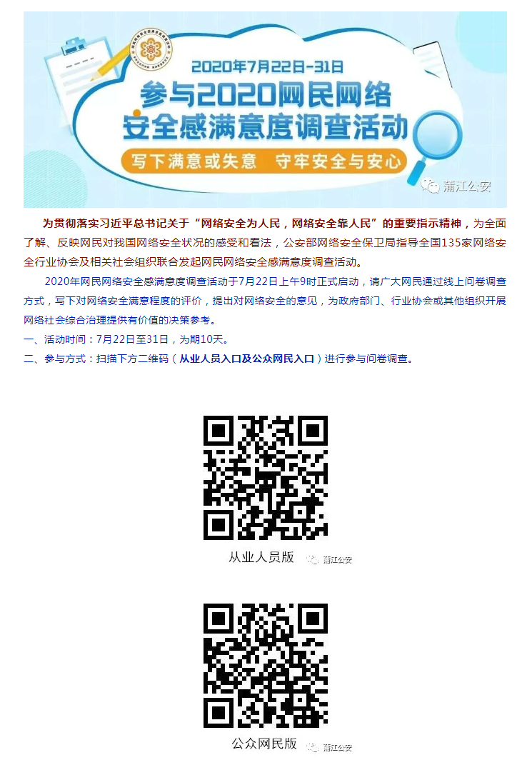 【蒲警直播】2020年度网民网络安全感满意度调查活动开始啦!