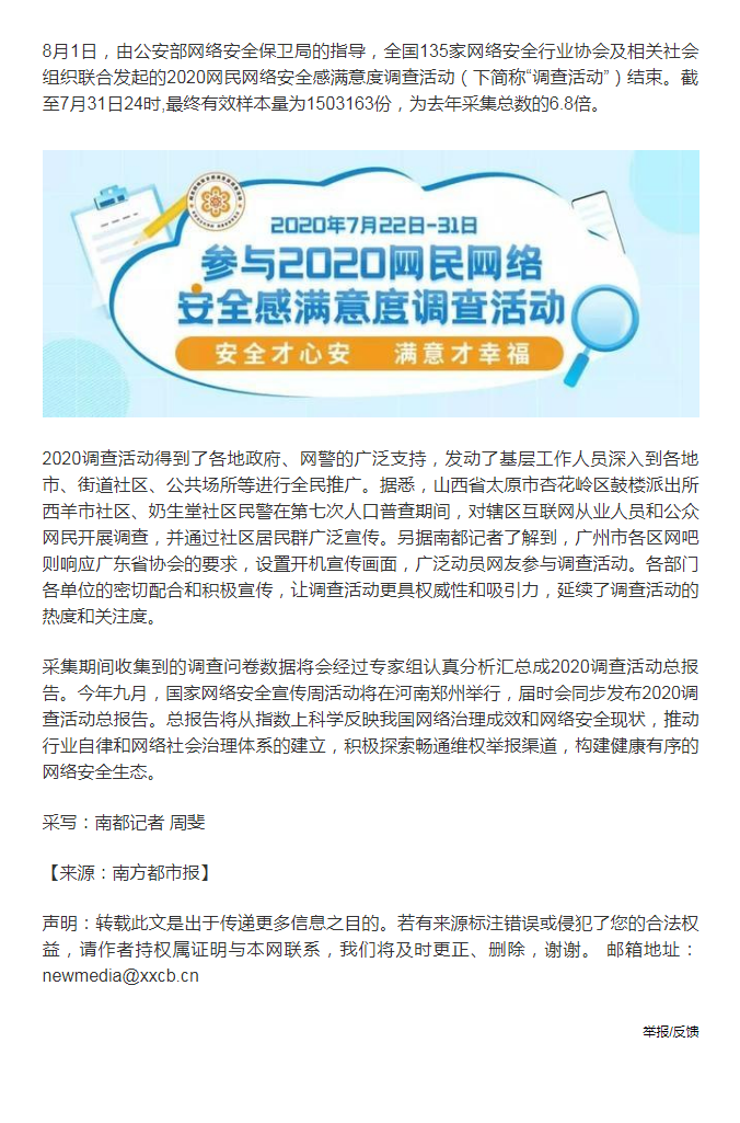 2020网络安全感满意度调查样本数破150万,9月发布总报告