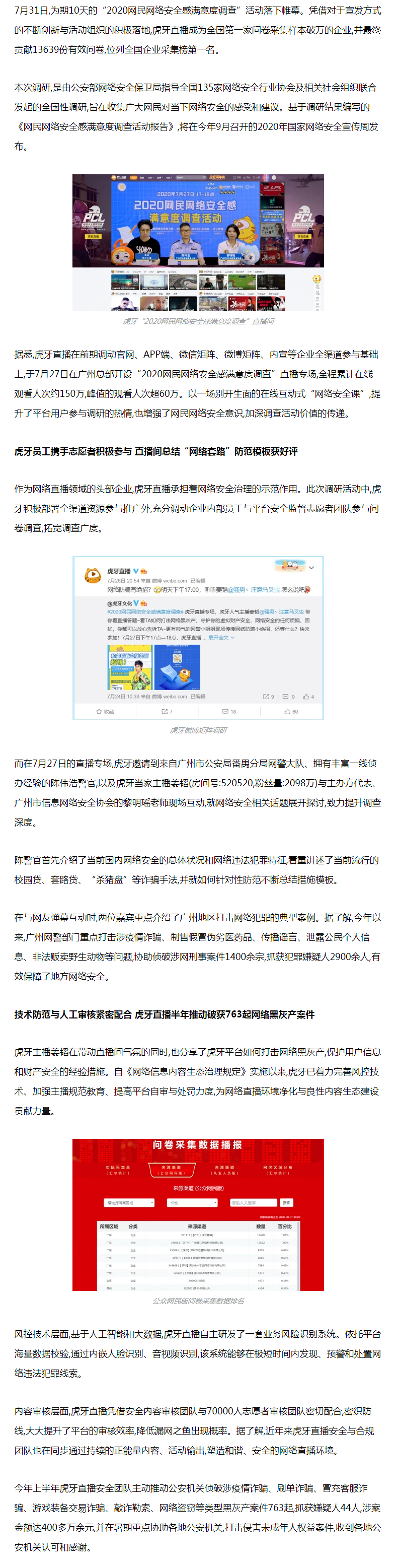 2020网民网络安全感满意度调查结束 虎牙直播排全国企业问卷采集榜第一