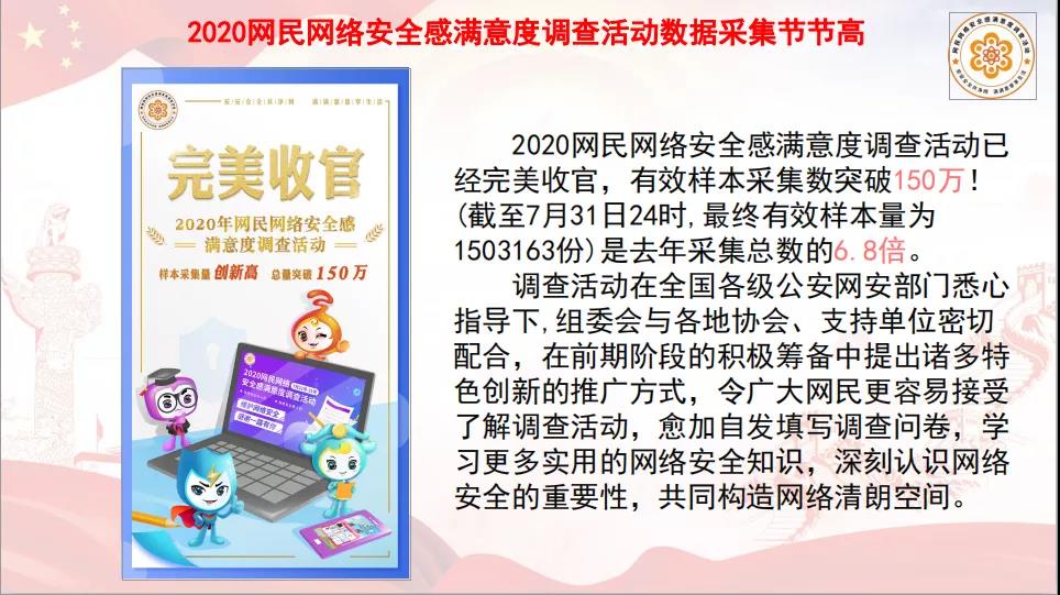 2020网民网络安全感满意度调查活动再创辉煌,全国总问卷量超150万份,编制了全国报告、地方报告、专题报告、行业报告共230份,收集网民对网络安全社会治理的意见和建议超16万份,赢得数量级的变化,实现了质的飞跃,得到了公安部等相关政府职能部门和企业、媒体以及有关机构的关注、肯定和采信。