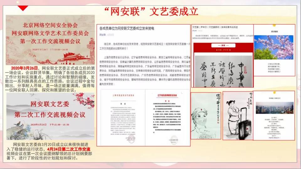 为大力弘扬中华传统文化,利用现代网络信息技术,充分展现网安联领域具有诗歌文学艺术正能量的网络社会组织,提升网安联文化品位,打造文化品牌,通过讴歌网安联人文精神,激励网安联人更加奋发向上,凝聚力量,努力为国家建设清朗网络空间做出贡献。2020年3月,“北京网络空间安全协会网安联网络文学艺术工作委员会”简称网安联文艺委)正式成立。