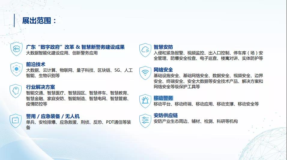 活动由网安联秘书处单位广东省网络空间安全协会负责安博会中网络空间安全会议、展览及相关活动的牵头组织实施工作,将设置智能安防展区、行业应用展区、综合展区、网络安全展区、人工智能/大数据展区、智慧警务应用展区、智能警务装备展区、数字政府&智慧新警务展区等八大展区,聚焦广东“数字政府”改革 & 智慧新警务建设成果、智慧安防、网络安全、移动警务等内容。
